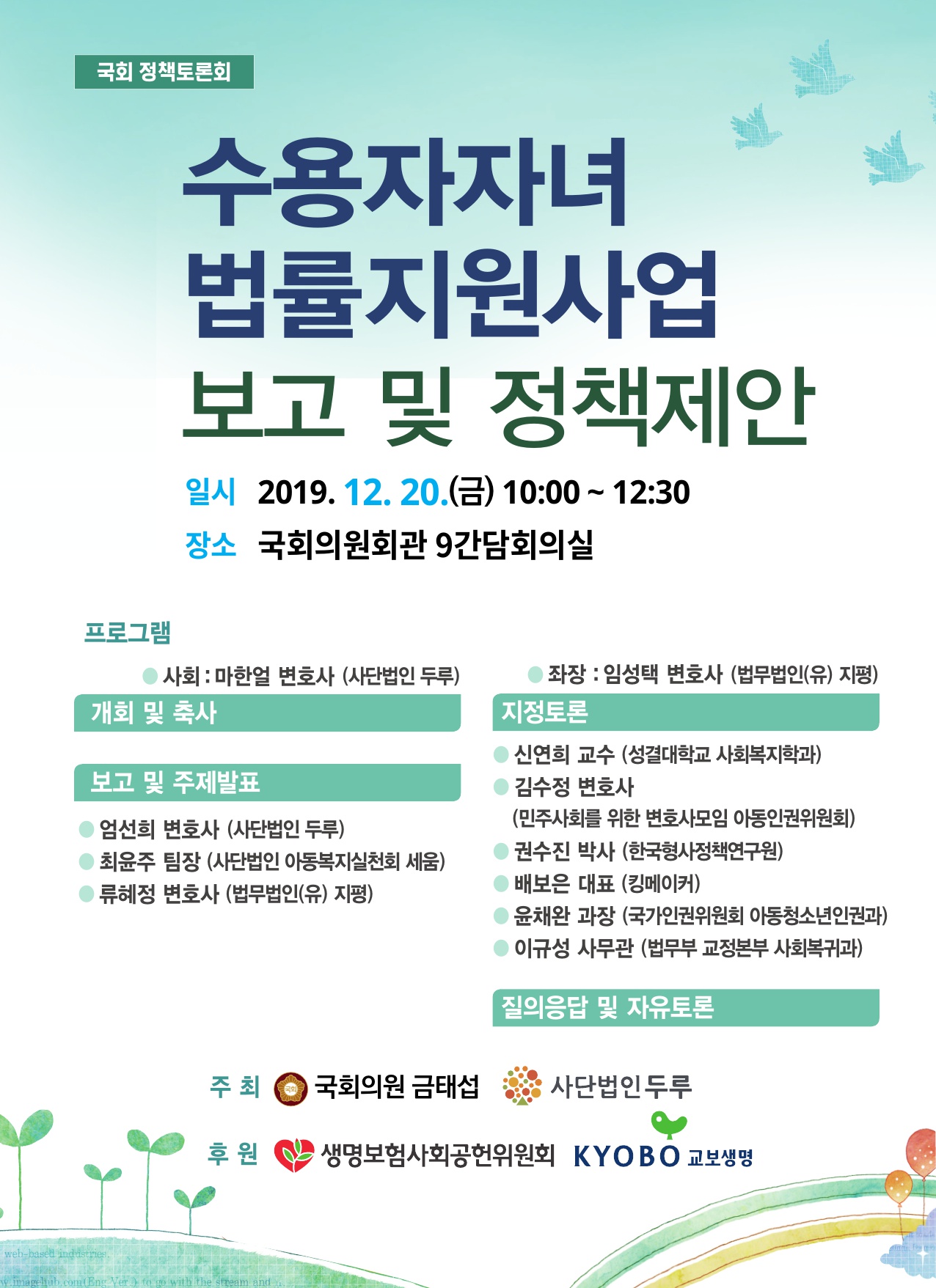 사단법인 두루에서 2019년 1년동안 생명보험사회공헌위원회와 교보생명의 후원으로 진행한 "수용자자녀 법률지원사업"의 결과를 보고하고 수용자자녀를 위한 정책 및 법률을 제안하기 위해 정책토론회를 주최합니다.