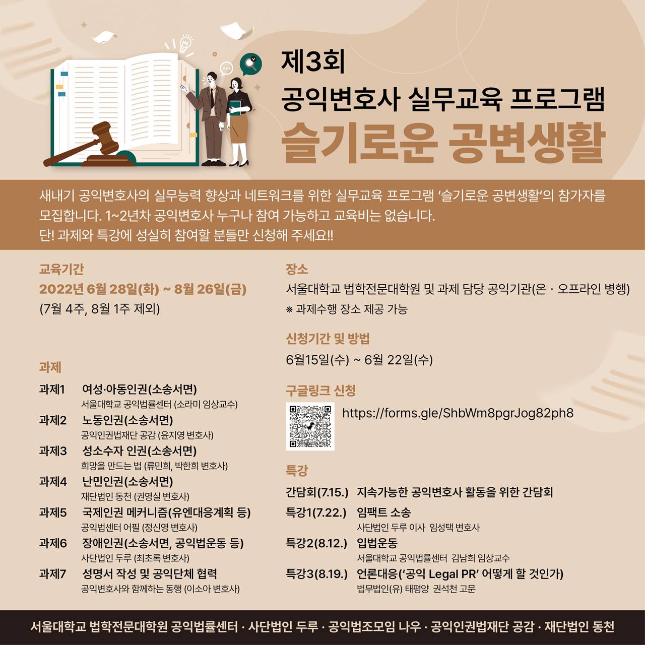 그 외에도 과제와 특강에 희망을 만드는 법, 공익법센터 어필, 공익변호사와 함께하는 동행 등 다양한 공익법단체가 참여합니다.