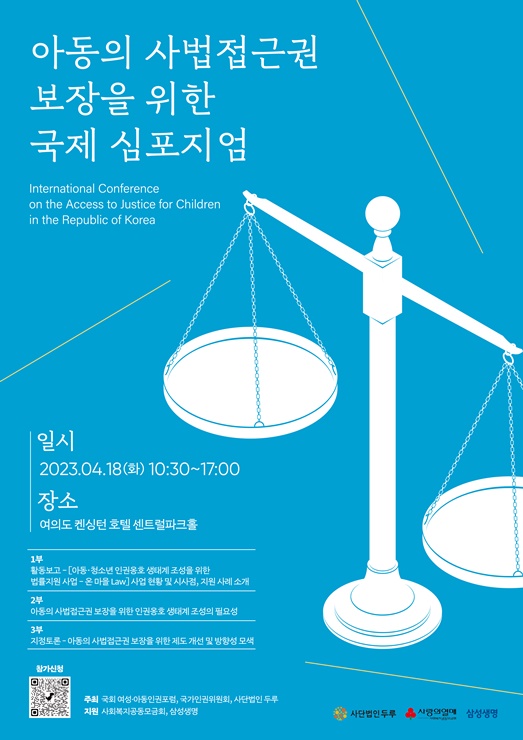 2023년 4월 18일, 두루는 온 마을 Law의 1차년도 사업을 마무리하며 국회 여성ㆍ아동인권포럼, 국가인권위원회와 함께 공동으로 「아동의 사법접근권 보장을 위한 국제 심포지엄」을 개최했습니다.