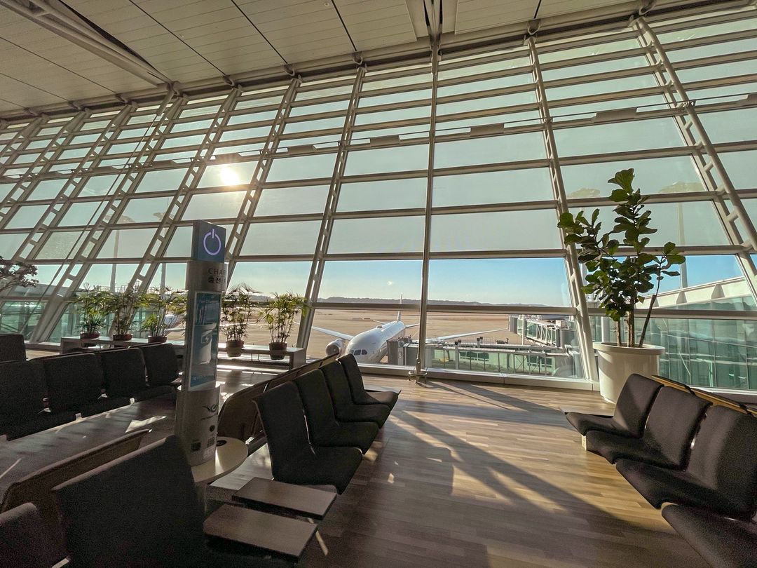 <창 밖으로 비행기가 보이는 인천국제공항 출국 대기 구역의 사진>