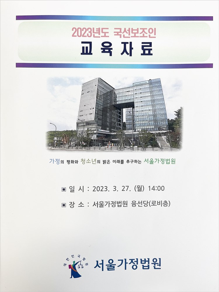 두루의 마한얼, 엄선희 변호사가 2023년 서울가정법원의 국선보조인으로 지정되어 신규 국선보조인 교육에 참여하였습니다. 2023년 3월 27일(월) 서울가정법원에서 진행된 “2023년도 국선보조인 교육”에서는 소년보호재판의 실무와 관련하여 소년보호재판 절차, 국선보조인제도에 대한 강의, 서울소년분류심사원 등에 대한 설명과 가정·아동보호사건에서의 국선보조인의 역할에 대한 강의가 진행되었습니다.