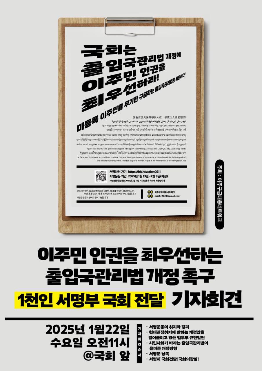 붙임 3: <이주민 인권을 최우선하는 출입국관리법 개정 촉구 서명부 국회 전달 기자회견> 웹 포스터