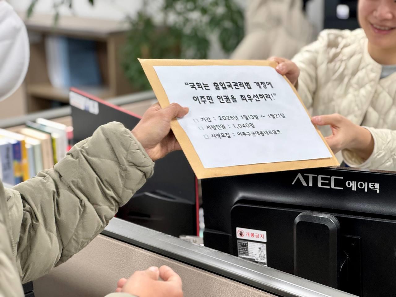 "이주민 인권을 최우선하는 출입국관리법 개정 촉구" 서명운동은 지난 1월13일부터 시작하여 현재 일주일 정도 진행 중입니다. 이 서명운동의 취지는 출입국관리법 개정은 국내체류 외국인 모두에게 해당하는 중요한 문제임에도 한국정부와 국회가 외국인들에게 이 사실을 알리고 의견을 수렴하기 보다는 시간에 쫓겨 졸속으로 처리하려 하고 있어 국내체류 외국인과 한국사회에 이번 출입국관리법 개정의 주요내용과 쟁점을 설명하고 올바른 개정을 위한 의견을 수렴하여 국회에 전달하고자 하는 것입니다.
