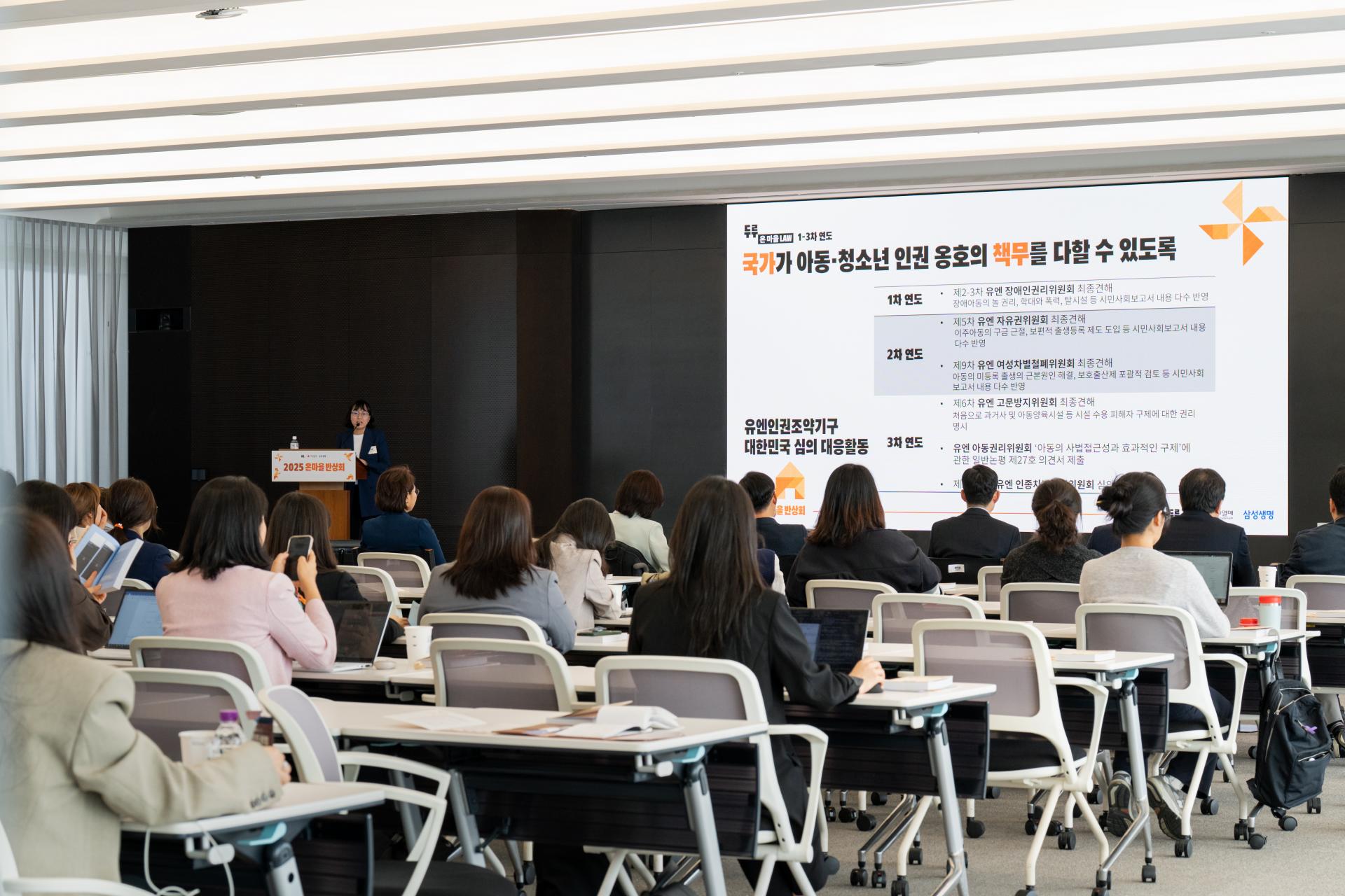 30일 열린 「온 마을 Law」 성과 공유 행사 '2025 온 마을 반상회'에는 (ㄱㄴ순) 김진석 온 마을 Law 자문심의위원회 위원장, 백선희 의원(조국혁신당), 최보윤 의원(국민의힘), 두루 임성택 이사장, 홍원학 삼성생명 사장 등 내외빈과 ‘온 마을 Lawyer’, 아동ㆍ청소년 관련 단체 관계인 등 100여 명이 참석한 가운데 사업성과 발표, 아동ㆍ청소년 권리옹호활동 공유 등의 프로그램이 진행됐다.