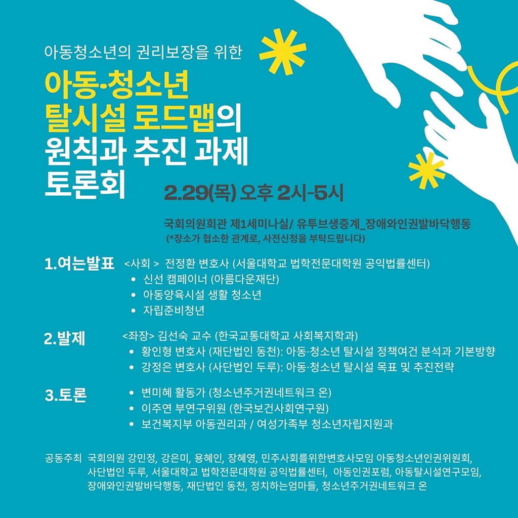 국회의원 강민정, 강은미, 용혜인, 장혜영과 사단법인 두루, 민변 아동청소년인권위원회, 서울대학교 법학전문대학원 공익법률센터, 아동인권포럼, 아동탈시설연구모임, 장애와인권발바닥행동, 재단법인 동천, 정치하는 엄마들, 청소년주거권네트워크 온은 오는 2024. 2. 29. 목요일 오후 2시 여의도 국회의원회관 제1세미나실에서 아동·청소년의 탈시설권리 보장을 위한 ‘아동·청소년 탈시설 로드맵의 원칙과 추진 과제’ 토론회를 공동 개최한다.
