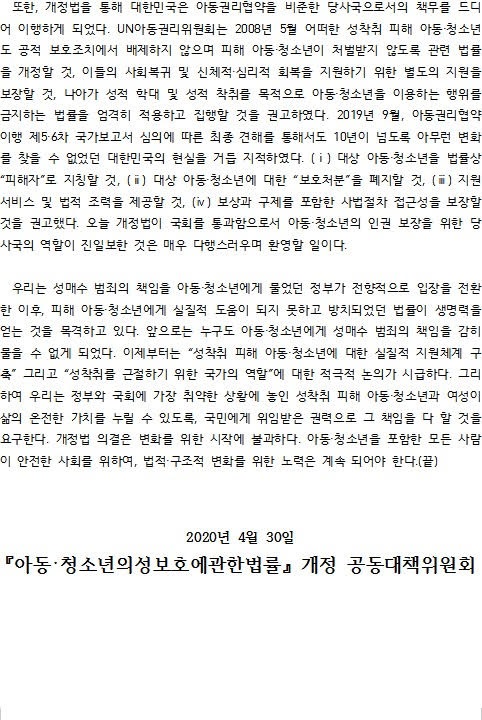 2020년 4월 30일 오전 0시 30분 경, 국회 법제사법위원회에 2년 넘게 계류되었던 아동·청소년의 성보호에 관한 법률 일부개정안이 국회 본회의에서 통과되었습니다.