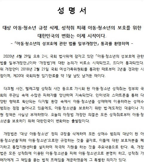 [아동·청소년의 성보호에 관한 법률 일부개정안 통과를 환영하는 공대위의 성명]