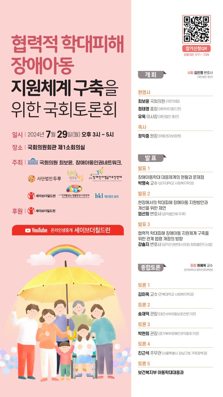 2024. 7. 29. 두루를 포함한 장애아동인권네트워크 소속 단체와 최보윤 국회의원은 국회의원회관 제1소회의실에서 '협력적 학대피해 장애아동 지원체계 구축을 위한 국회토론회’를 개최하였습니다. 자세한 내용은 자료집을 참고하시기 바랍니다.